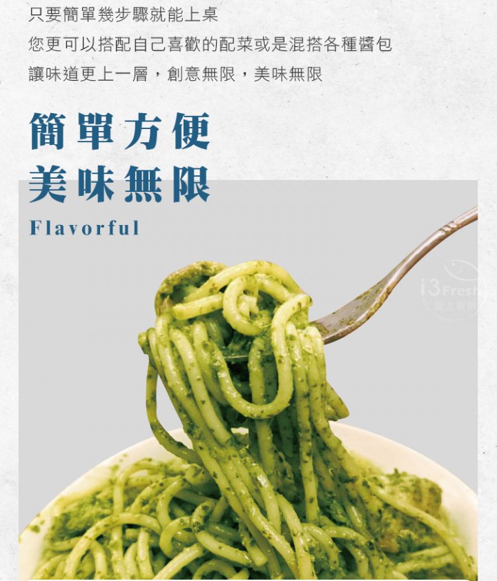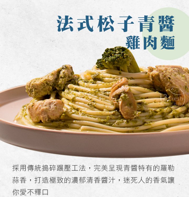 醬成分:水、九層塔、橄欖油、松子 、油漬小鯷魚(餛魚.葵花油.鹽)、乳酪粉(牛乳.鹽.凝乳酵素.蛋白溶菌酶.天然香料)、蒜、青花菜、雞肉、鮮奶油(酪牛奶(水.酪乳粉))、蘑菇片、洋蔥、砂糖、鹽、味精(L-麩酸鈉、 5'-次黃嘌呤核苷磷酸二鈉、5'-鳥嘌呤核苷磷酸二鈉)、白胡椒粉、洋香菜葉