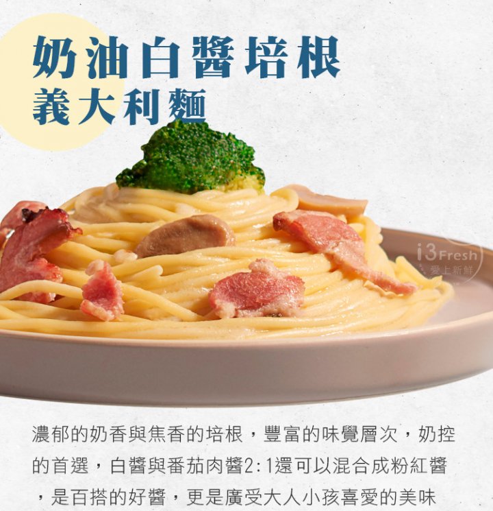 醬成分:水、鮮奶油(酪牛奶(水.酪乳粉))、培根(豬肉(原產地:加拿大))、鹽、大豆蛋白、乳清蛋白、多磷酸鈉、味素(L-麩酸鈉、胺基乙酸、DL-胺基丙酸、呈味核甘酸二鈉(5'-次黃嘌呤核苷磷酸二鈉、5'-鳥嘌呤核苷磷酸二鈉)、琥珀酸二鈉)、異抗壞血酸鈉(抗氧化劑)、紅丹-L-2(蟲漆酸、鉀明礬、酒石酸鈉、磷酸氫鈣、無水碳酸鈉)、新硝精(鹽、亞硝酸鈉)、洋菇片、青花菜、無鹽奶油、麵粉、西洋芹菜、紅蘿蔔、青蔥、蒜、玉桂葉、洋蔥、砂糖、蒜仁、牛奶糖(水飴.糖.煉乳.乳粉.棕櫚仁油.乳清粉.香料.大豆蛋白.卵磷脂.碳酸氫銨.脂肪酸山梨醇酐酯)、洋香菜葉、白胡椒粉